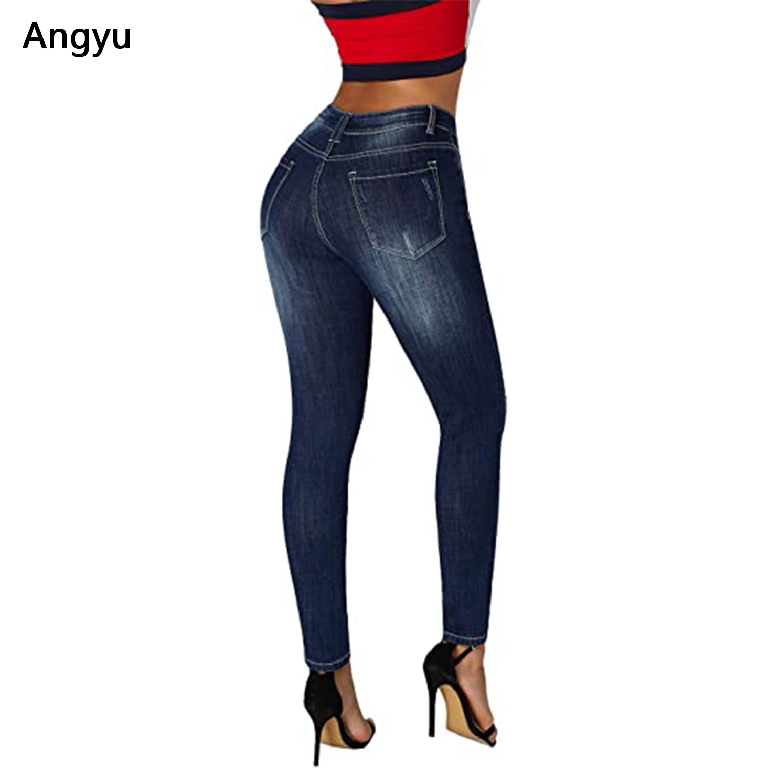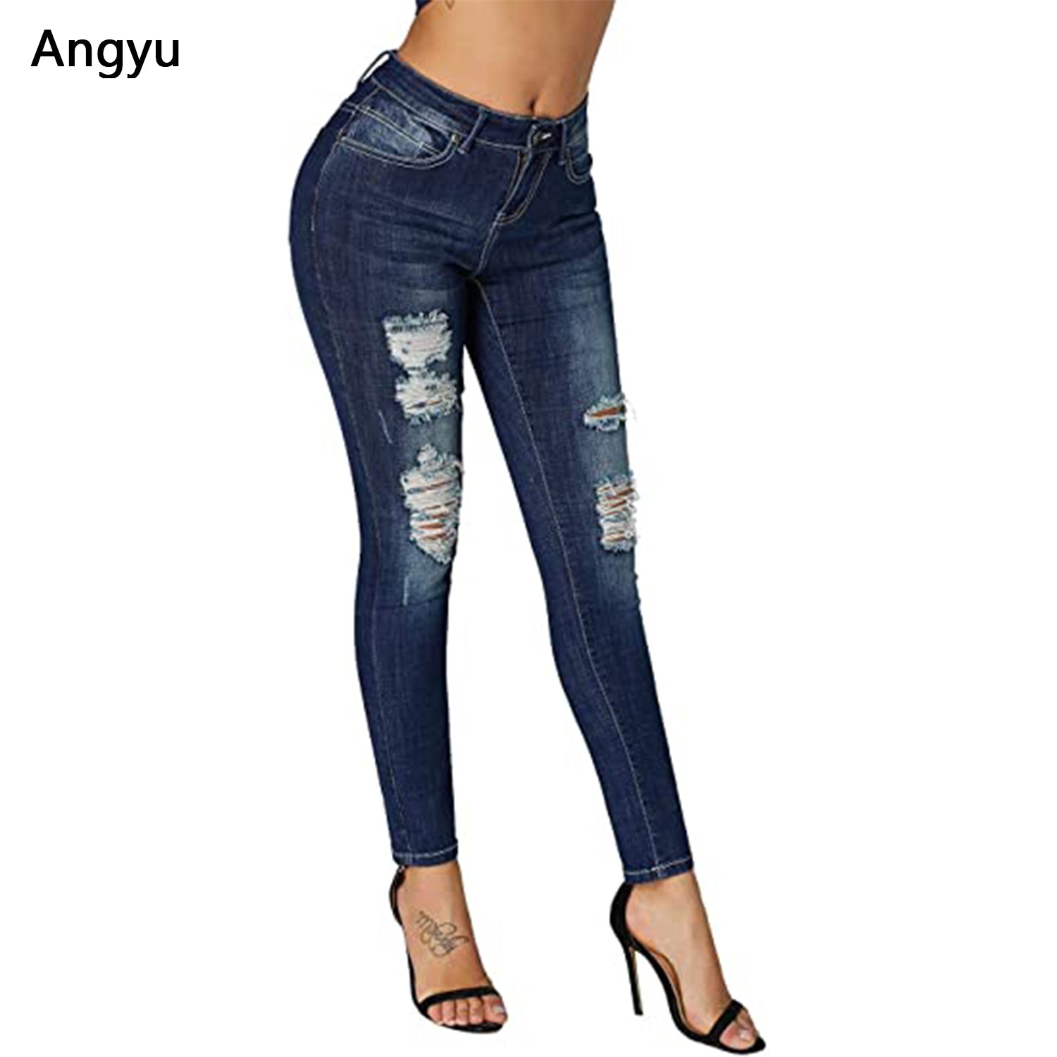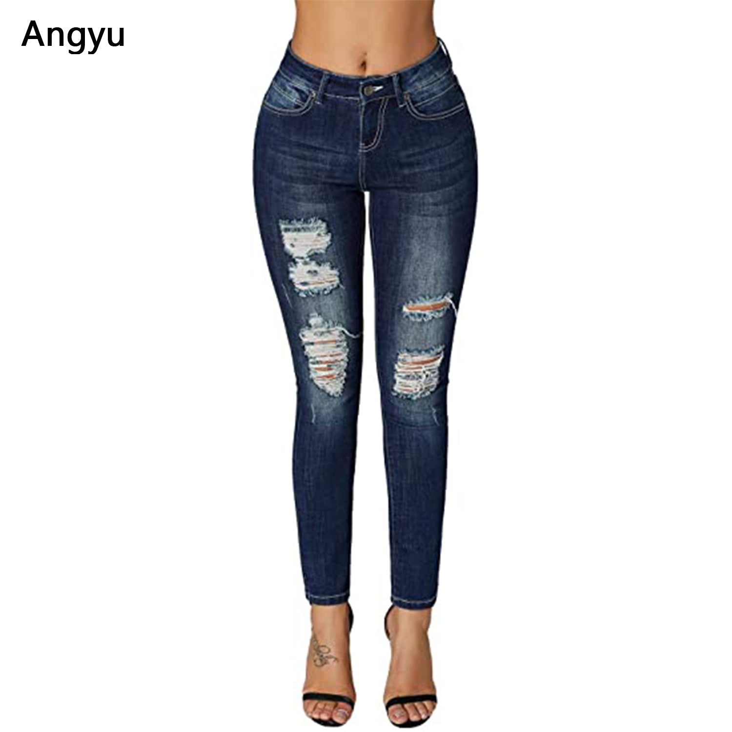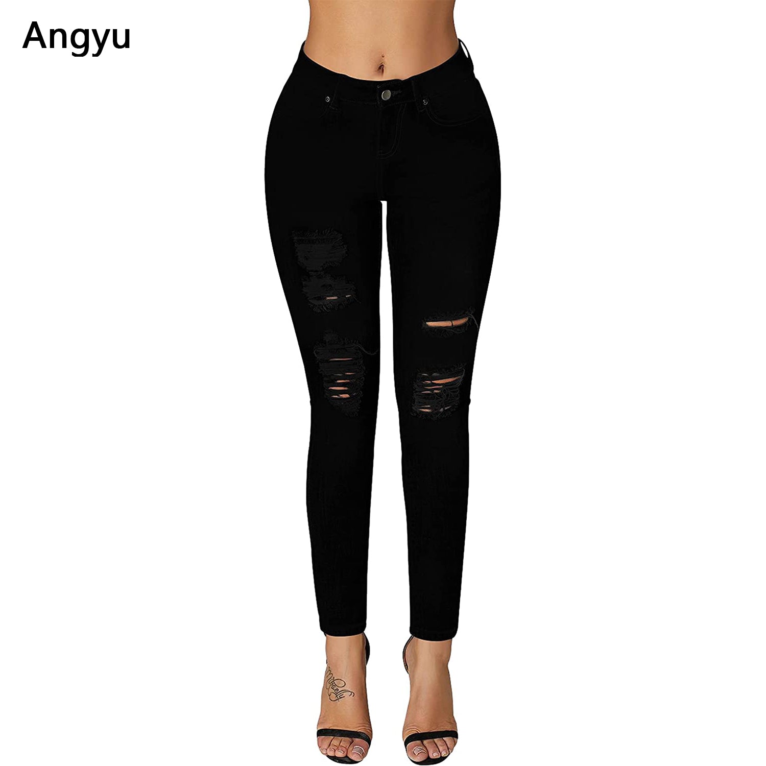 Angyu Women's Ripped Mid Rise Destroyed Skinny Jeans