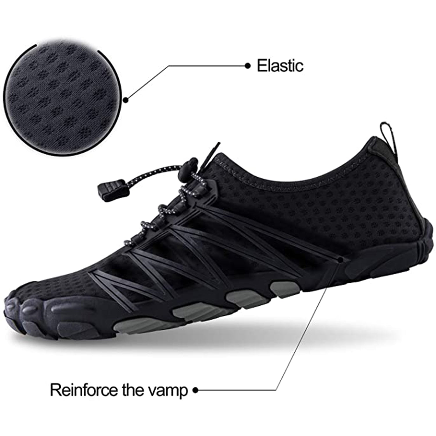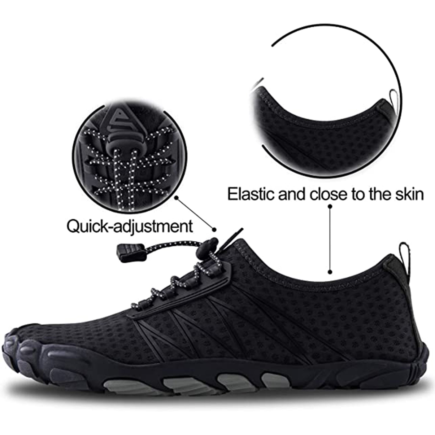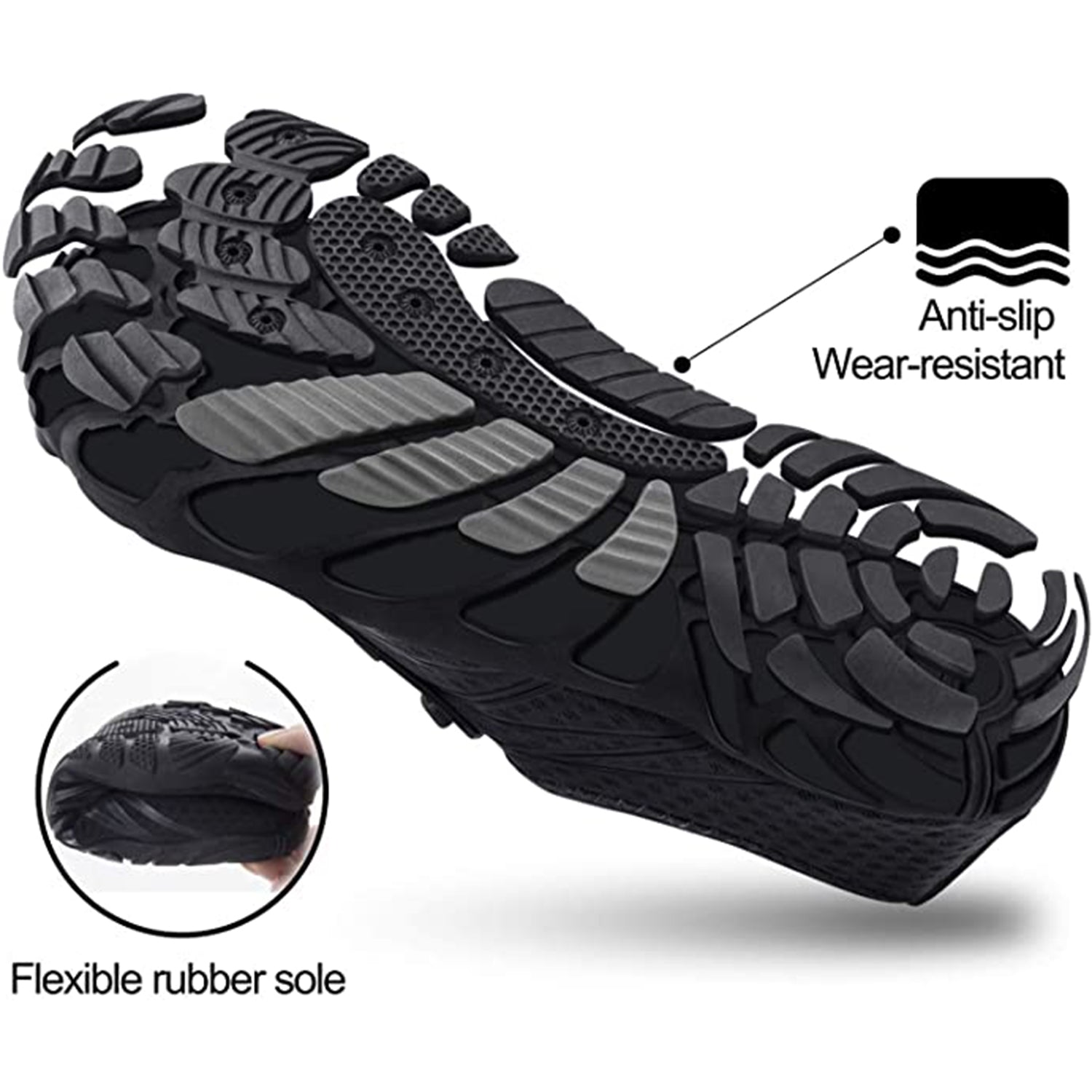 All-round Protection: Thick rubber soles and a toe cap keep your feet completely protected from sharp objects and provide great cushioning. The 3D non-slip treads provide exceptional grip even in slippery conditions. This makes it a great choice for outdoor sports.