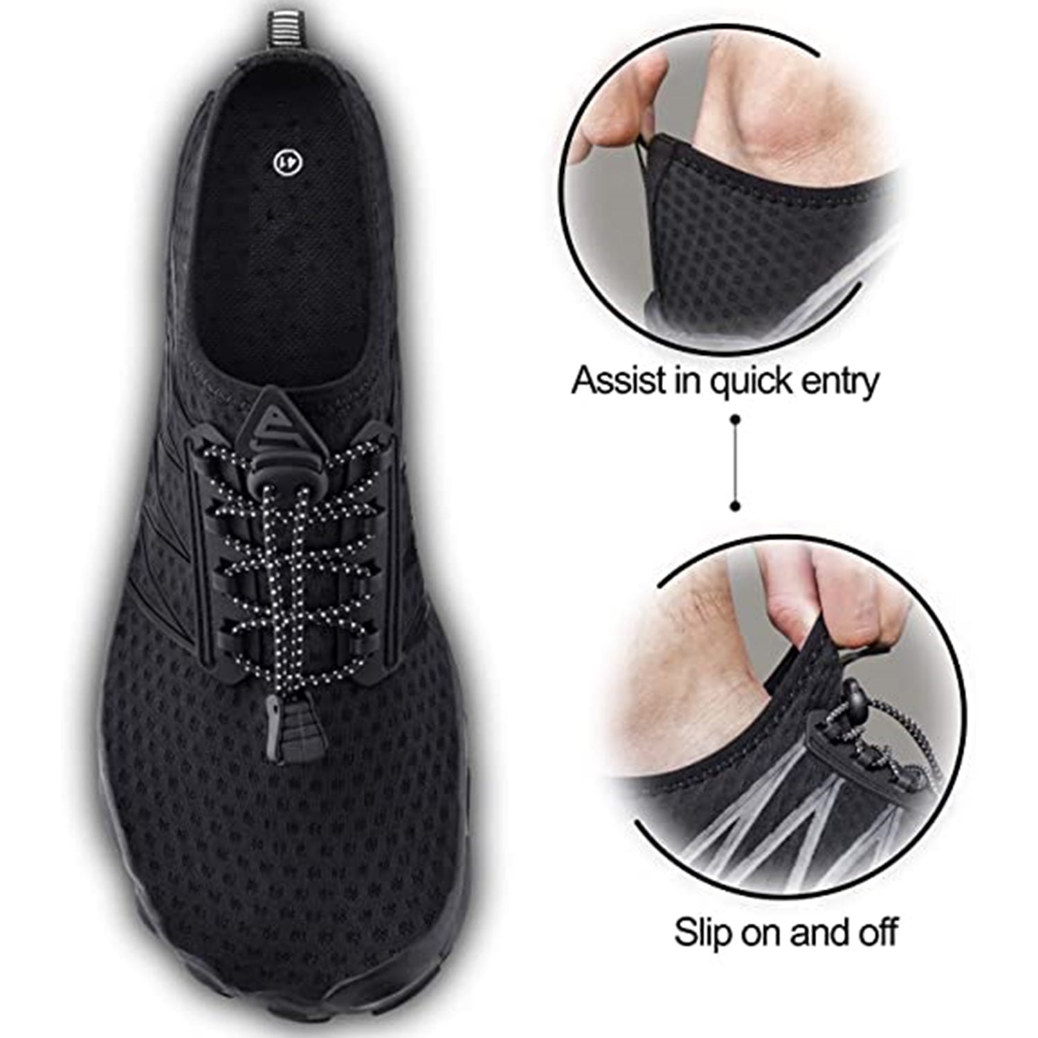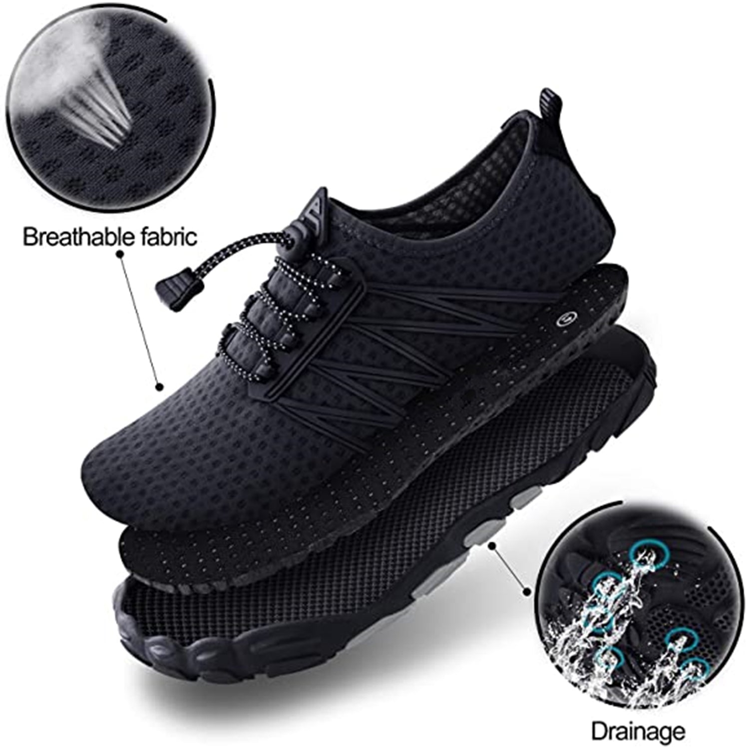 Breathing shoes: The shoe was designed to be ultra-breathable: The spandex vamp has tiny air holes for quick drying and the outsoles、insoles are designed with drainage holes to drain the water. This forms a perfect breathing system that keeps your feet cool and dry, from the inside to the outside.